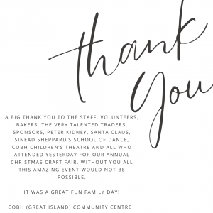 Cobh Children’s Theatre and all who attended yesterday for our annual Christmas Craft Fair. Without you all this amazing event would not be possible.