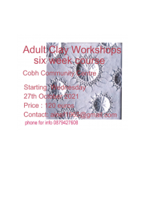 Adult Clay Workshop2021-10-142021-10-14https://cobhcommunitycentre.ie/wp-content/uploads/2016/08/200.pngCobh Great Island Community Centrehttps://cobhcommunitycentre.ie/wp-content/uploads/2016/08/200.png200px200px