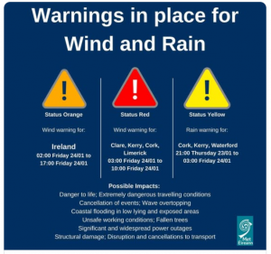 Due to the wind warning in place for Cork this Friday 24th January 2025