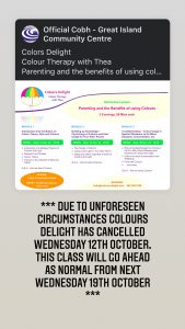 *** Colours Delight Rescheduled ***2022-10-112022-10-11https://cobhcommunitycentre.ie/wp-content/uploads/2016/08/200.pngCobh Great Island Community Centrehttps://cobhcommunitycentre.ie/wp-content/uploads/2016/08/200.png200px200px