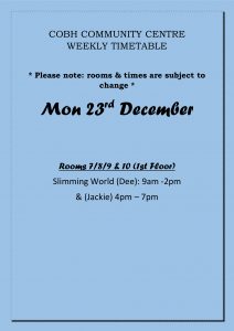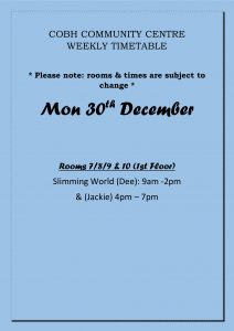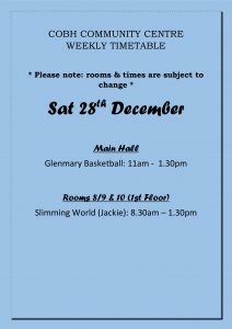 Mon 23rd, Sat 28th & Mon 30th December Timetable ๐2019-12-232019-12-18https://cobhcommunitycentre.ie/wp-content/uploads/2016/08/200.pngCobh Great Island Community Centrehttps://cobhcommunitycentre.ie/wp-content/uploads/2016/08/200.png200px200px