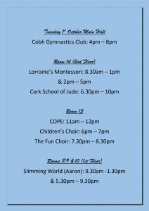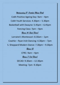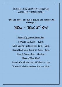Mon – Wed 2nd October Timetable ๐2019-09-302019-09-27https://cobhcommunitycentre.ie/wp-content/uploads/2016/08/200.pngCobh Great Island Community Centrehttps://cobhcommunitycentre.ie/wp-content/uploads/2016/08/200.png200px200px