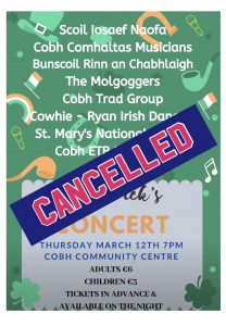 It is with great sadness that we at Cobh (Great Island) Community Centre have decided to cancel our St. Patrick’s Concert for this year due to the extremely contagious COVID-19. The health & wellbeing of our community is our priority and we thank you for your understanding.