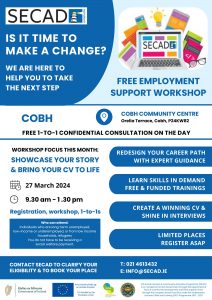 The next Workshop and Employment Support session with SECAD Partnership CLG – SECAD in Cobh as part of the SICAP 2024-2028 programme. The session will begin with a workshop and then the opportunity for attendees to meet one of the members of their experienced employment team for a one-to-one consultation on the day ![]()