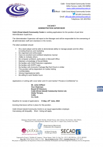 Cobh (Great Island) Community Centre is seeking applications for the position of part-time Administration Supervisor. Deadline for receipt of applications: