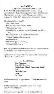 Cobh (Great Island) Community Centre is seeking applications for the position of PERMANENT part-time Caretaker.