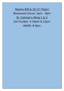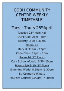 Introducing our new weekly timetable with groups using the centre. We will split this into two from Monday – Wednesday and Thursday – Sunday each week. With Monday being a bank holiday we started with Tues of next week.