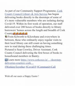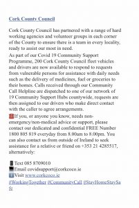 Cork County Council are now available to respond to vulnerable persons for assistance with daily needs. Well done ๐๐